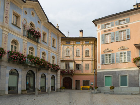 Poschiavo, Switzerland - October 14th 2023: Beautiful historic buildings in the old town.