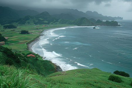 Lush Green Hills, Foamy Waves, and a Cloudy Sky Overlooking a Coastline