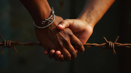 Couple holding hands over barbed wire showing concept of overcoming obstacles and finding hope in difficult situations