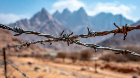 This setting features a barbed wire fence stretching across a sandy terrain, with rugged mountains rising in the distance beneath a bright sky.