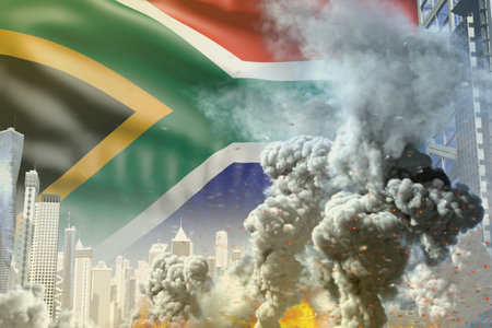 large smoke column with fire in the modern city - concept of industrial disaster or act of terror on South Africa flag background, industrial 3D illustration