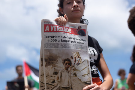 Salvador, Bahia, Brazil - November 11, 2023: Protesters are seen holding signs during a protest against the war on Palestine in the city of Salvador, Bahia.