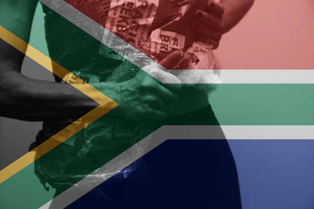 South Africa national flag on leader's fist hands (clipping path) for human rights, leadership, reconciliation concept