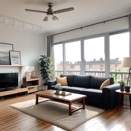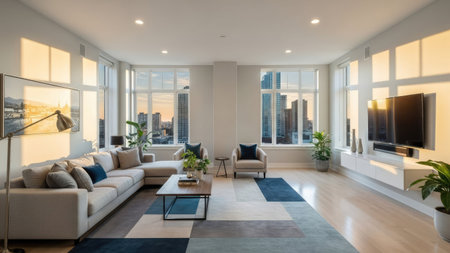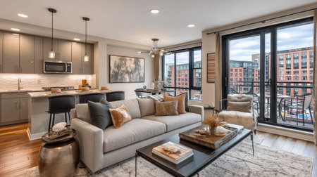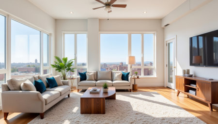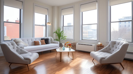 Bright townhouse living room with plush seating and large windows, comfort. generated by ai