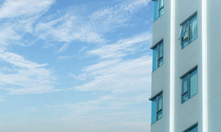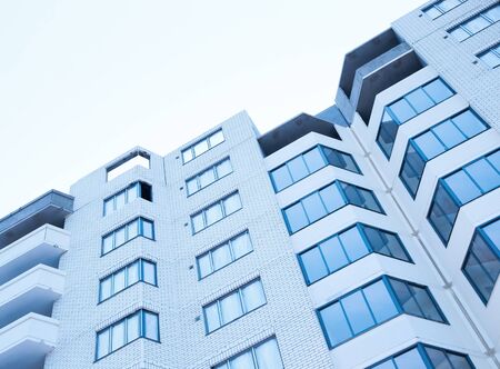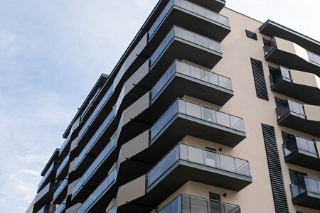 Detail of Modern residential flat apartment building exterior. Fragment of New luxury house and home complex. Part of City Real estate property and condo architecture. Copy space. Blue sky