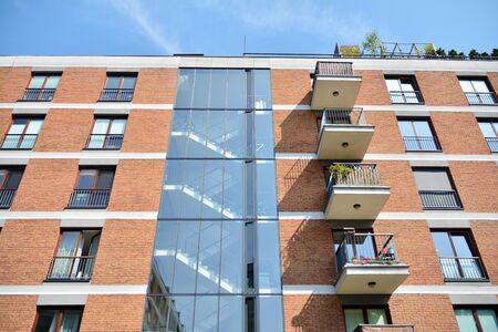 Architectural details of modern apartment building. Modern european residential apartment building complex.