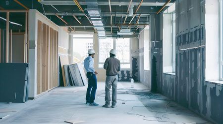 Construction workers renovating apartment hallway with tools and natural light for home improvement