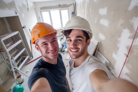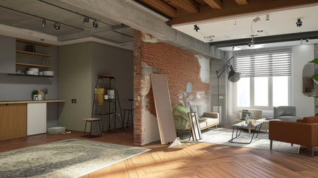 Posing for renovation photos along completed areas, capturing the essence of the transformation. Copy Space.