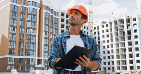 builder in hard hat holding clipboard on construction site