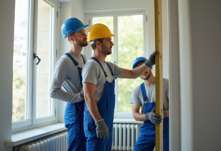 Three skilled builders, clad in blue overalls and hard hats, collaborate on a measurement task in a bright, airy room. Their focused expressions and teamwork highlight the importance of precision in construction, while the sunlight streaming through the windows adds a warm, inviting atmosphere to the scene.