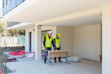 engineers with design project of furniture or apartment on construction site.