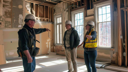 Back view of professional man overseeing interior renovation crew in a residential setting