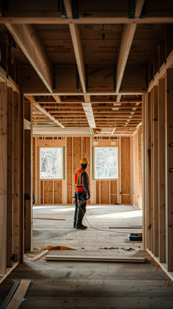 Construction worker in protective clothing and reflective vest walking towards the entrance of a new house