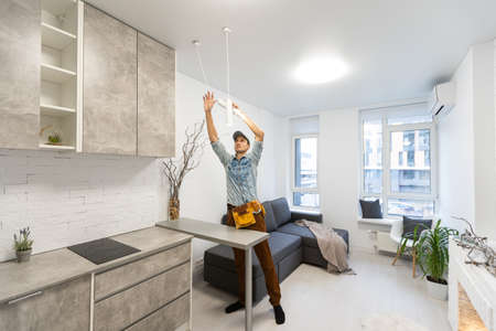 Repairman fixing ceiling lamp in cafe kitchen