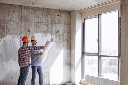Two men Architect and engineer in vests and hardhats inspecting and discussing blueprint while working in unfinished room of apartment building