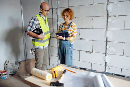 Couple planning home renovation job together, construction worker working with woman on maintenance and remodeling of apartment. Contractor and builder helping with interior design of family home