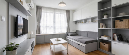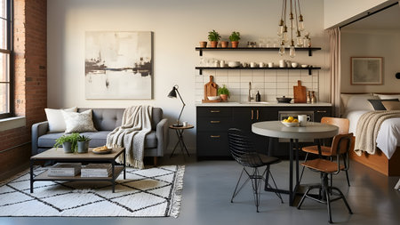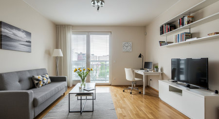 Small, comfortable and stylish designed apartment with big windows and living room, kitchen and dining area in one room