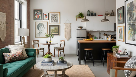 A cozy living room showcases a world map, natural light, and a blending kitchen area with warm tones.