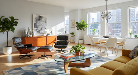 A spacious, sunlit living room featuring mid-century modern furniture, including a leather lounge chair and a glass coffee table. Large windows offer a city view, while potted plants add a touch of nature to the minimalist decor.