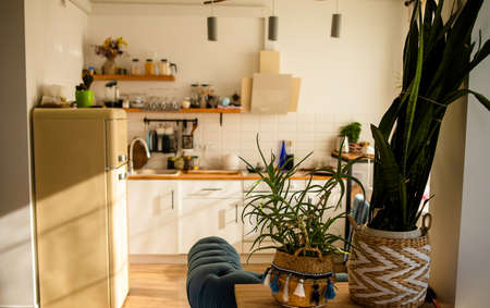 Modern kitchen interior with beige retro refrigerator and green plant.