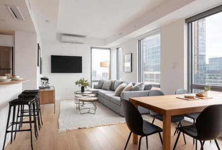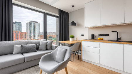 This living room showcases contemporary design with neutral colors and natural light. A gray sofa, wooden furniture, and black chairs are arranged in a spacious area. Large windows offer city views, creating a bright and inviting atmosphere. Ideal for illustrating real estate, interior design, or lifestyle content.