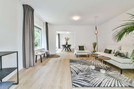 Table with chairs and flowers located near lounge area and kitchen in spacious room of contemporary apartment