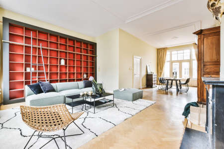 Sun lit living room with big windows and gray couch with carpet against red book shelves