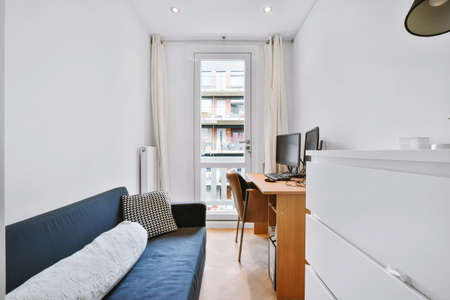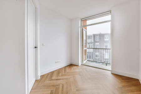 Small bright empty room with white walls and door leading to balcony in modern apartment