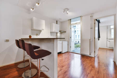Counter with chairs dividing kitchen with modern furniture from dining area in contemporary flat