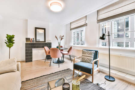 Table with chairs and flowers located under lamp against balcony entrance and lounge area in spacious room of modern apartment