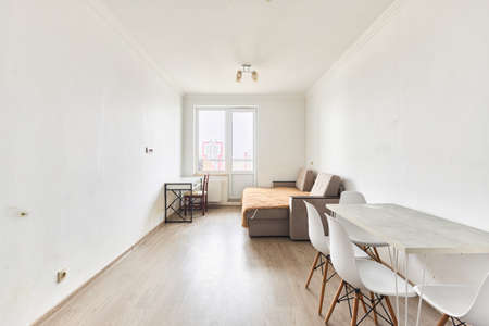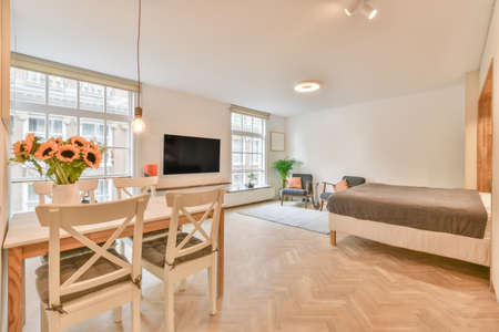 Contemporary minimalist style interior design of light studio apartment with wooden table and chairs in dining zone in living room with white walls and parquet floor