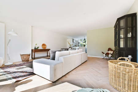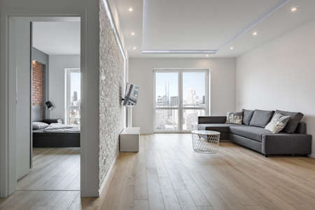 Modern flat with spacious bedroom and cozy living room designed in minimal style
