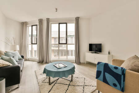Living room with carpet, mild sofa, table, and other luxury furniture and TV set
