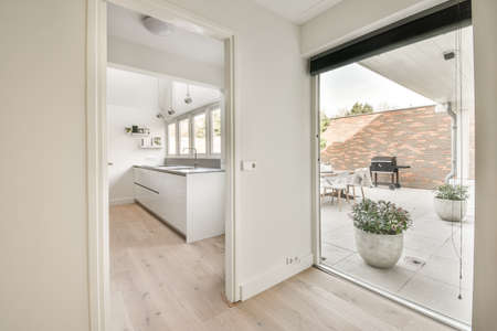 Corner of modern kitchen with white walls, wooden floor and white cabinets