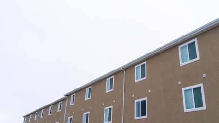 Panorama Back view of townhouses with snowy roofs against overcast sky in winter