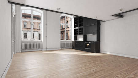 Contemporary minimalist style interior design of light studio apartment with wooden table and chairs in dining zone between open kitchen and living room with white walls and parquet floor