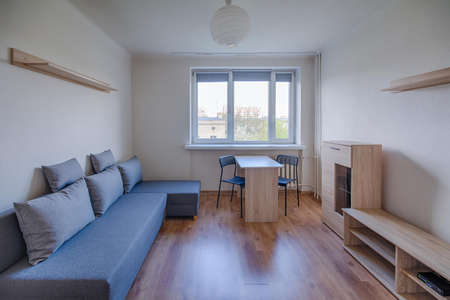 Panorama of small, comfortable and nice designed apartment with big window, wooden floor and living room, dining area and kitchen in one room