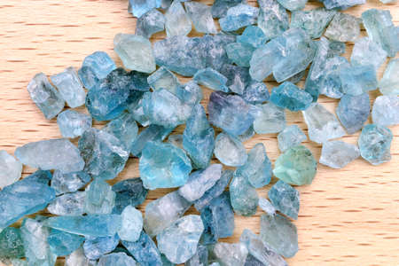 Apatite jewel stone texture on light varnished wood background. Macro closeup.