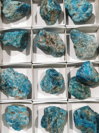 closeup of sample of natural mineral from geological collection - raw Apatite rock on white marble background