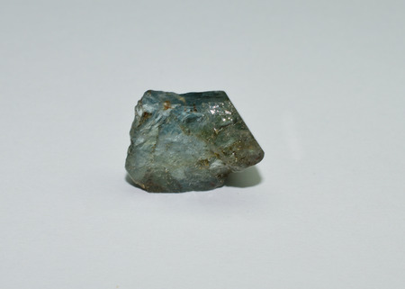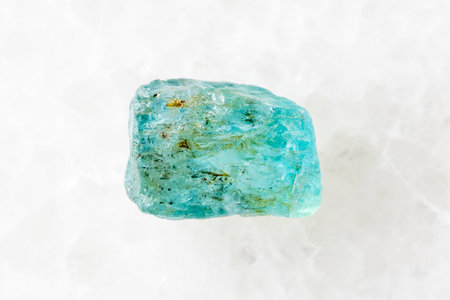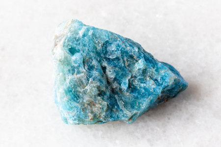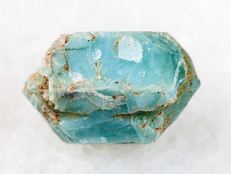 macro shooting of natural mineral rock specimen - raw crystal of blue apatite gemstone on white marble background from Slyudyanka district, Irkutsk region, Russia