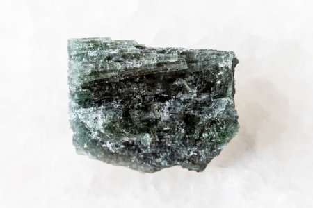 sample of rough green alexandrite crystal in daylight on white marble background close up from Ural, Russia