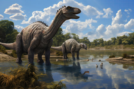 the argentinosaurus, a massive sauropod dinosaur, is depicted in a stunning illustration, boasting an extraordinary feature - a scorpion-inspired tail, blending prehistoric grandeur with arachnid menace, showcasing a fascinating fusion of ancient creatures in a fantastical, otherworldly setting, perfect for fans of paleoart and sci-fi. ai generated