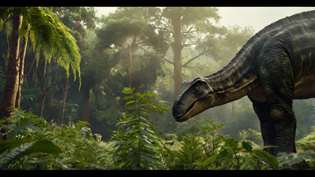A stunning depiction of a dinosaur in a misty jungle setting, surrounded by lush flora and tranquil waters. This serene scene captures the essence of ancient life on Earth.