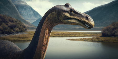 A large, prehistoric creature rises from the serene waters of a lake, showing its long neck and scaly skin. Towering mountains shrouded in fog form a dramatic backdrop, evoking a sense of wonder.