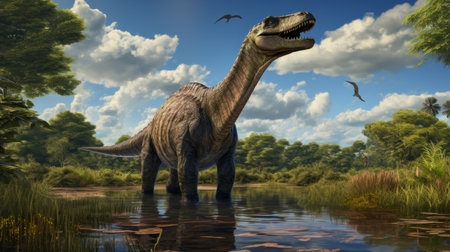 A massive dinosaur stands in shallow water, its long neck extended and mouth open, while birds soar above in a vibrant prehistoric environment filled with rich vegetation.