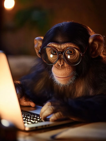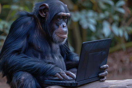 Focused chimpanzee using a laptop, illustrating technology in wildlife