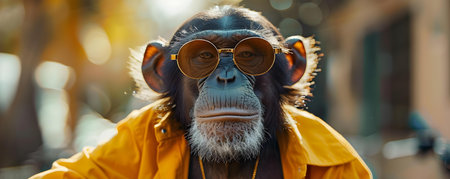 A stylish monkey struts through city wearing chic clothes blending urban wilderness. Concept Fashionable Urban Monkey, Stylish City Outfit, Wild Chic Appearance, City Jungle Trendsetter