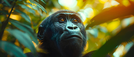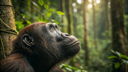 a magnificent gorilla stands tall in the heart of a lush and vibrant forest. an air of serenity and raw power as the gorilla gazes confidently into the distance, surrounded by natural beauty