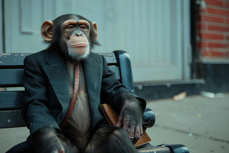 Well-dressed chimpanzee in a suit sits on a city bench, portraying a humorous business concept