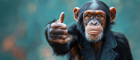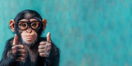 Chimpanzee monkey in glasses shows thumbs up on blue background